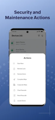 To ensure better device maintenance, you can take actions like restarting devices, clearing or resetting passcodes and remotely locking devices. Scans can be initiated on devices, to ensure undisturbed server-device contact, and the remote troubleshooting feature can help solve issues in real time.