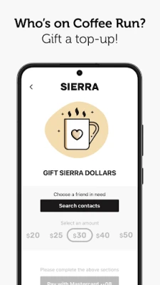 ● Gift Sierra Rewards Know someone in need of a caffeine fix? Or would love a sweet treat? You can send them Sierra Dollars in-app, delivered right to their mobile. If they don’t have the Sierra app, no problem! We’ll deliver it by SMS…